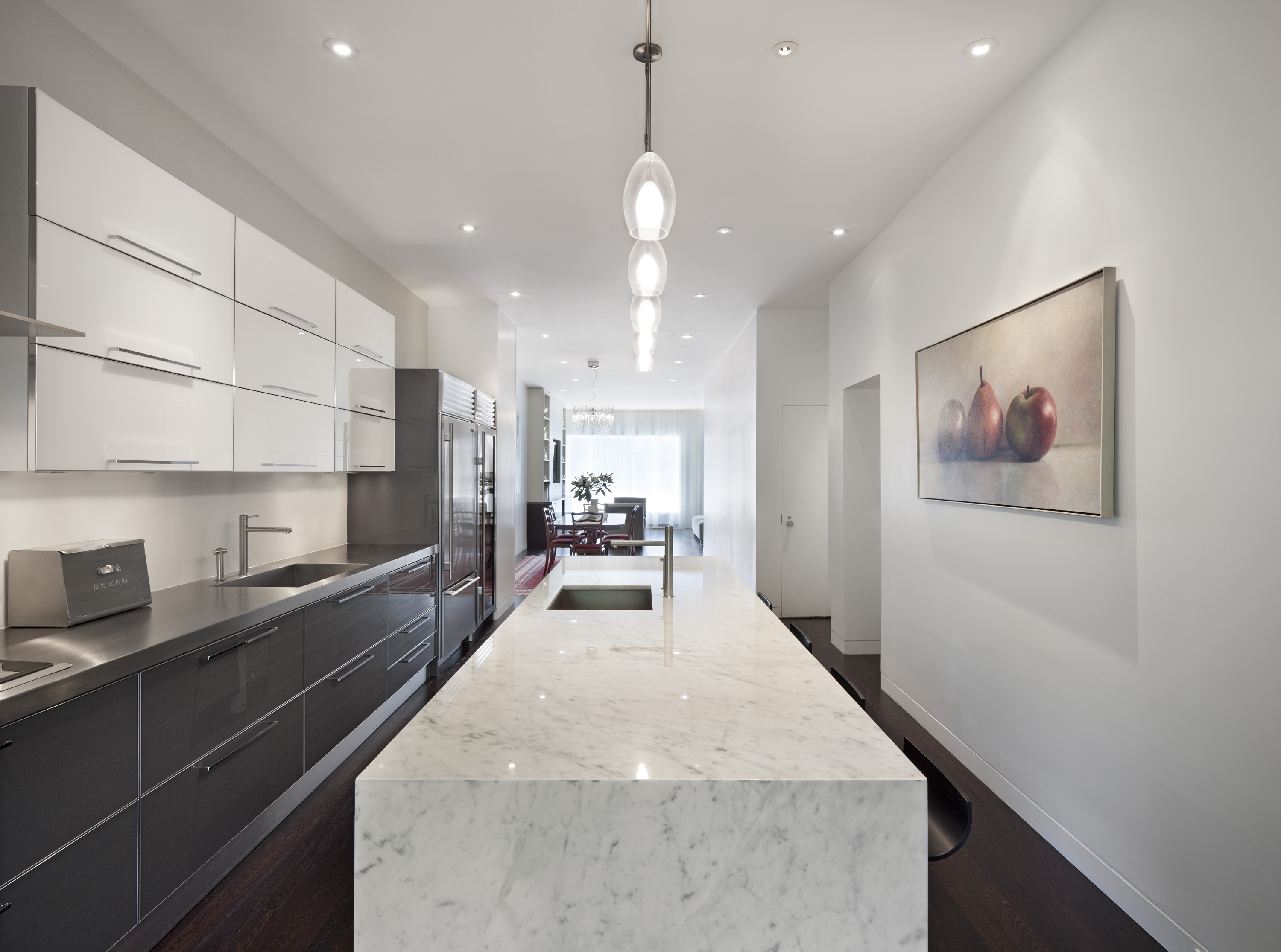 As project manager at James Wagman Architect, I oversaw the gut renovation of the main living floor and penthouse of this New York City triplex apartment from concept through construction. The client is an art dealer who wanted to turn her divided living space into an open gallery. To provide display space for larger paintings, we created three walls that appear to stand alone. The new living space appears simple due to careful detail work, ranging from a flush baseboard to a replacement fire escape basket built to align with the new exterior door opening.