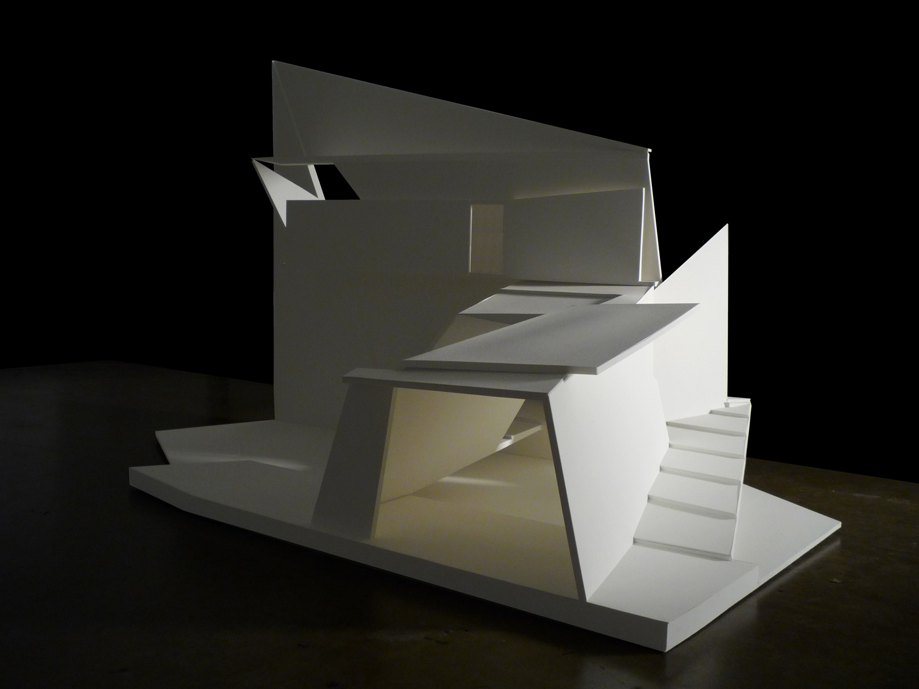 A landscape of contrasting scales guides a photographer on a circuitous path to a long-awaited meeting. Occasional views allow glimpses of the path ahead, his destination, and the friend he will meet there. The landscape is designed for the sun patterns of an imagined site in Argentina. Sunlight bathes the main expanse of the site during the day and aligns with the narrow viewing path at sunset, causing the wall it hits to glow. The model is constructed of museum board and structural foam core.