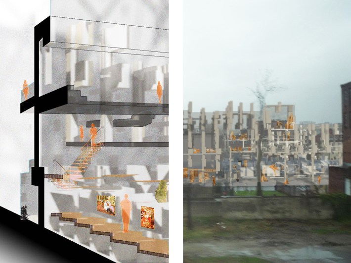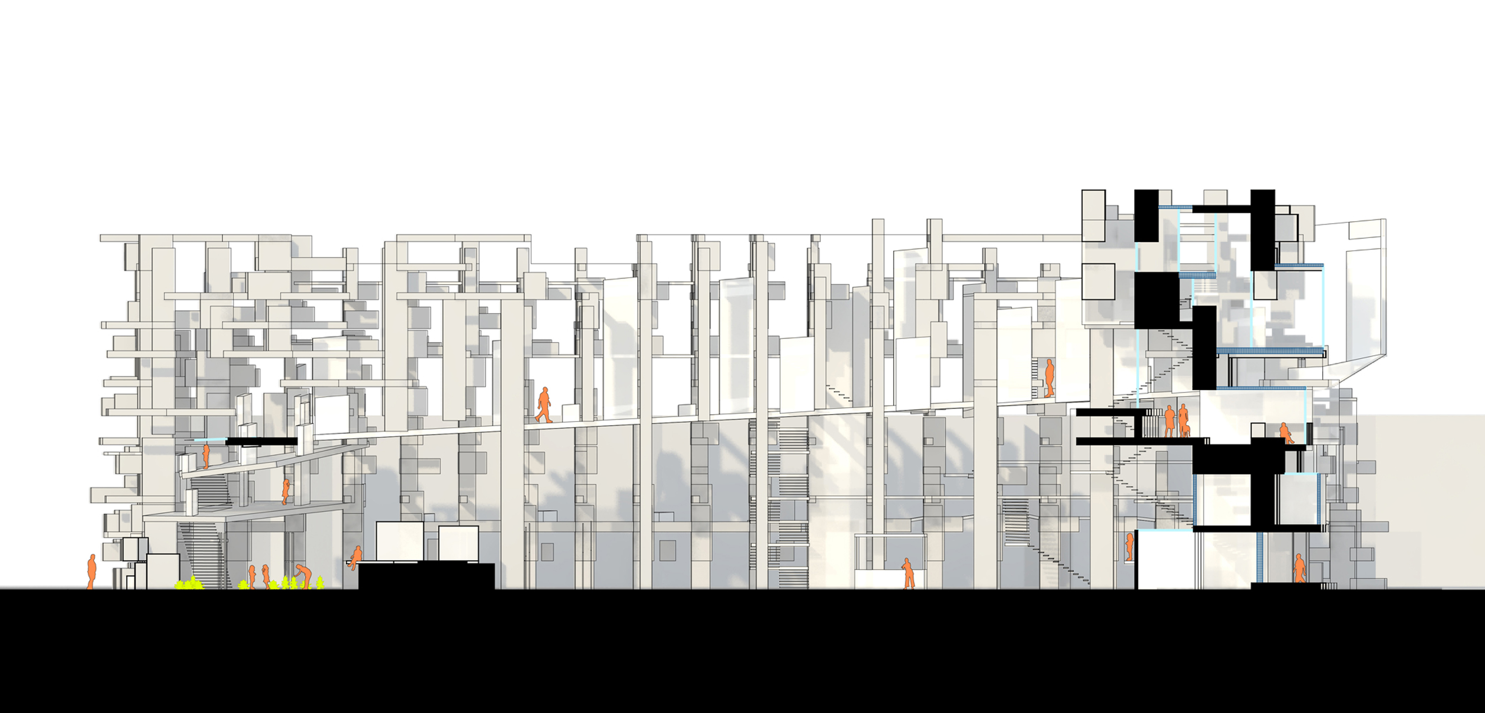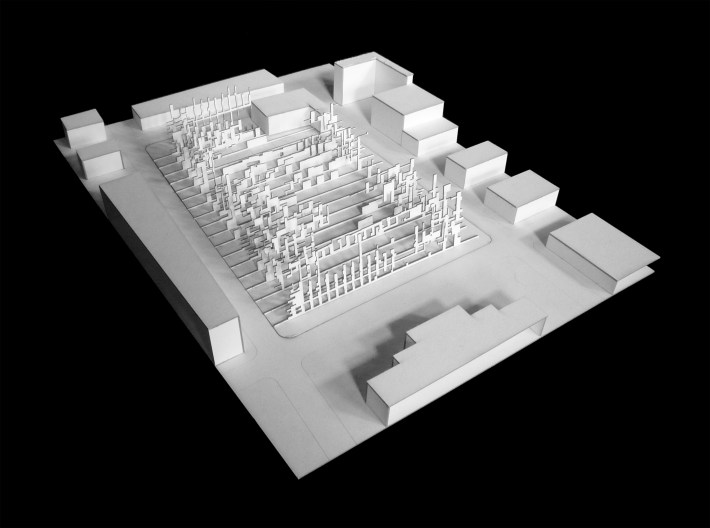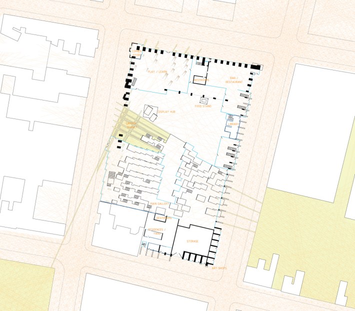 Program and form are arranged according to a scripted analysis of existing site visibility. The most visible areas become voids for more public program, such as galleries, children’s spaces, and outdoor space. Galleries are oriented along the axes of the views from certain external privileged points, making these the most visible from the outside. The least visible areas contain the more private program (design studios and artists’ residences, for example) surrounded by solid form. This strategy compartmentalizes program yet introduces unique juxtapositions, proving view to be unique design medium.