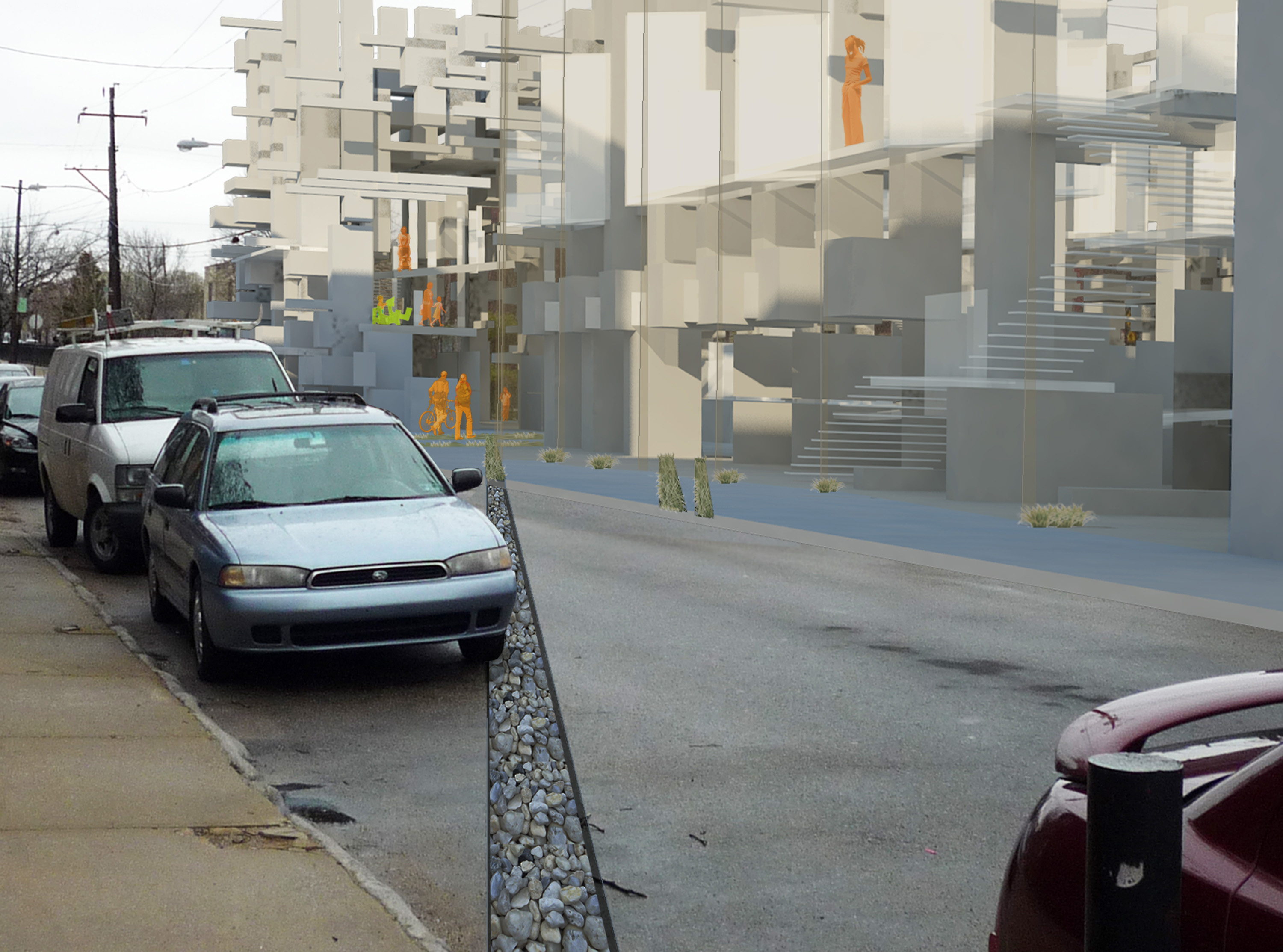 This is a proposal for a live-work art center in the gritty Kensington area of Philadelphia. The project manipulates views to privilege the artists who live and work within and to provide teasers for the curious observer from the outside. It is not a singular object, but rather a continuation of and reaction to the complex surrounding urban fabric. It lines the sidewalk as many buildings in the neighborhood do, but its porosity and varying depth of surface present an opportunity for the constant play of view augmentation and restriction. An overall understanding of the building is withheld from the passerby except from a few key points from which clearer views into the depths of the building are provided.