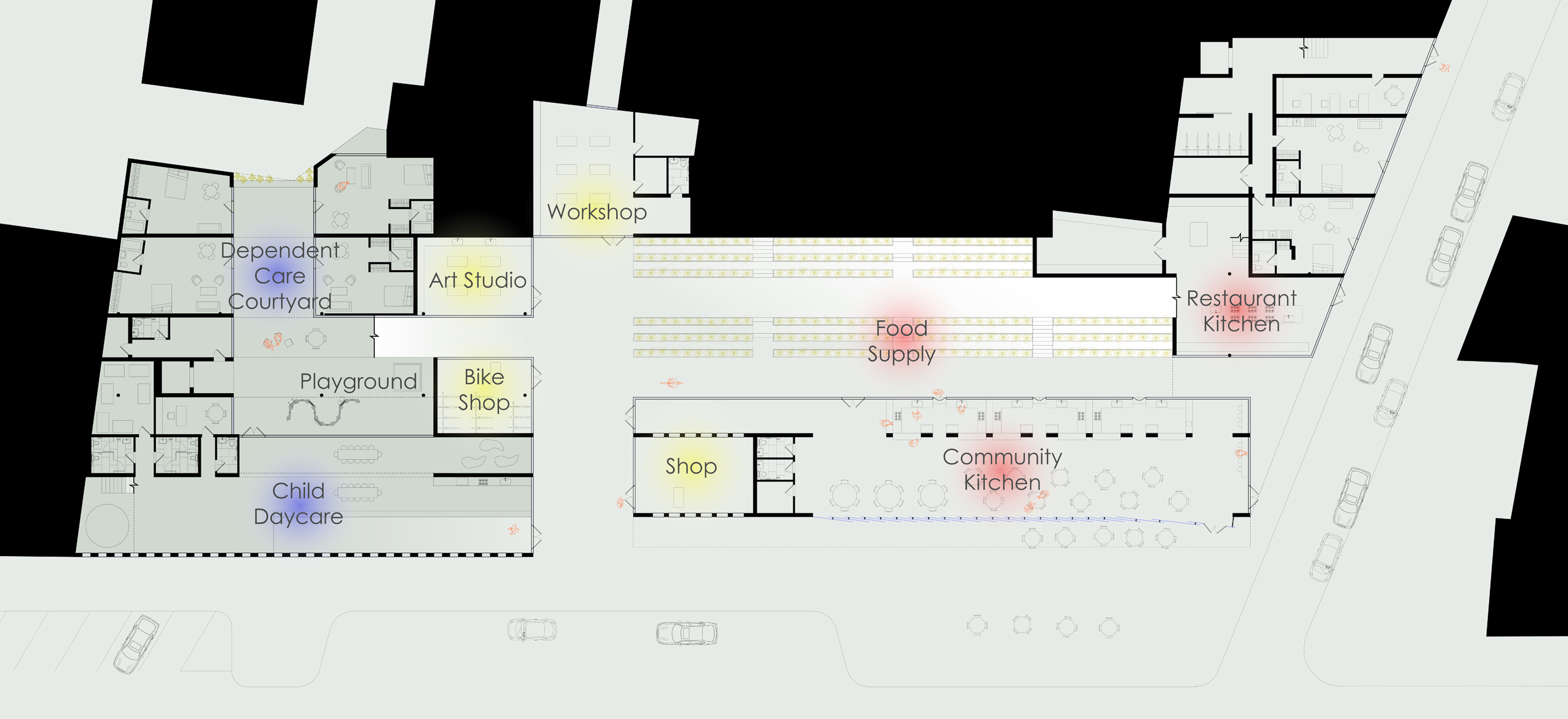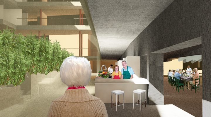 The majority of the target residents are relatively independent people looking for a supportive community with amenities such as nursing or meals as needed, but also use of their skills and interests and a connection to the surrounding neighborhood. The rest of the residents include some highly dependent people and some people who want to play less active roles. The community is based around food, craft, and care, with gardens for growing food, a restaurant, community cooking facilities, workshops, and interwoven adult and child daycare centers.