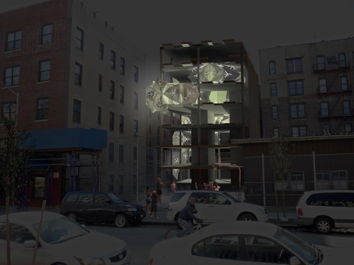 Temporary classrooms shown in an abandoned condominium development in Washington Heights. The existing school is behind this one.