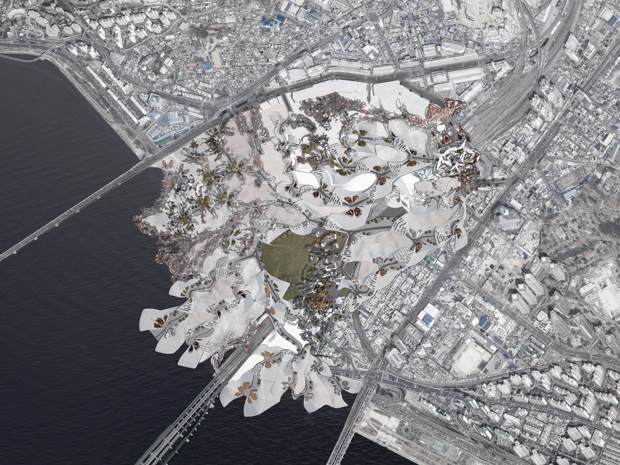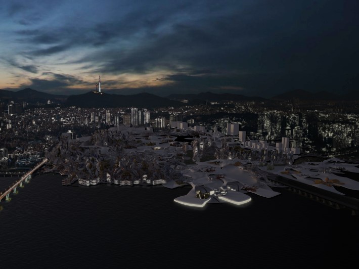 Seoul is a city predicated on density with moments of relief occurring outside of the center of the city in the mountains. Created in partnership with Jordan Barr, this Yongsan District urban proposal relies on a blend of both intense dense areas and open regions of relief to produce a locally balanced urban environment. This project’s organization goes beyond typical urban efficiencies—vehicular flow, orthogonal navigation, prescribed zoning. It is organized into inverted city blocks, with a street and buildings located at the center of the block. The size and formation of the inverted blocks varies, so the density and distance between buildings varies as well. In the densest areas, the buildings are located above the streets, and cars and pedestrians pass underneath them, while in the less dense areas the buildings are smaller and fragmented. Moving through the site from one block to the next, one passes through an urban gradient, with hyper-intense city life transitioning to an almost rural calm; thus this district possesses an organic experiential variation.